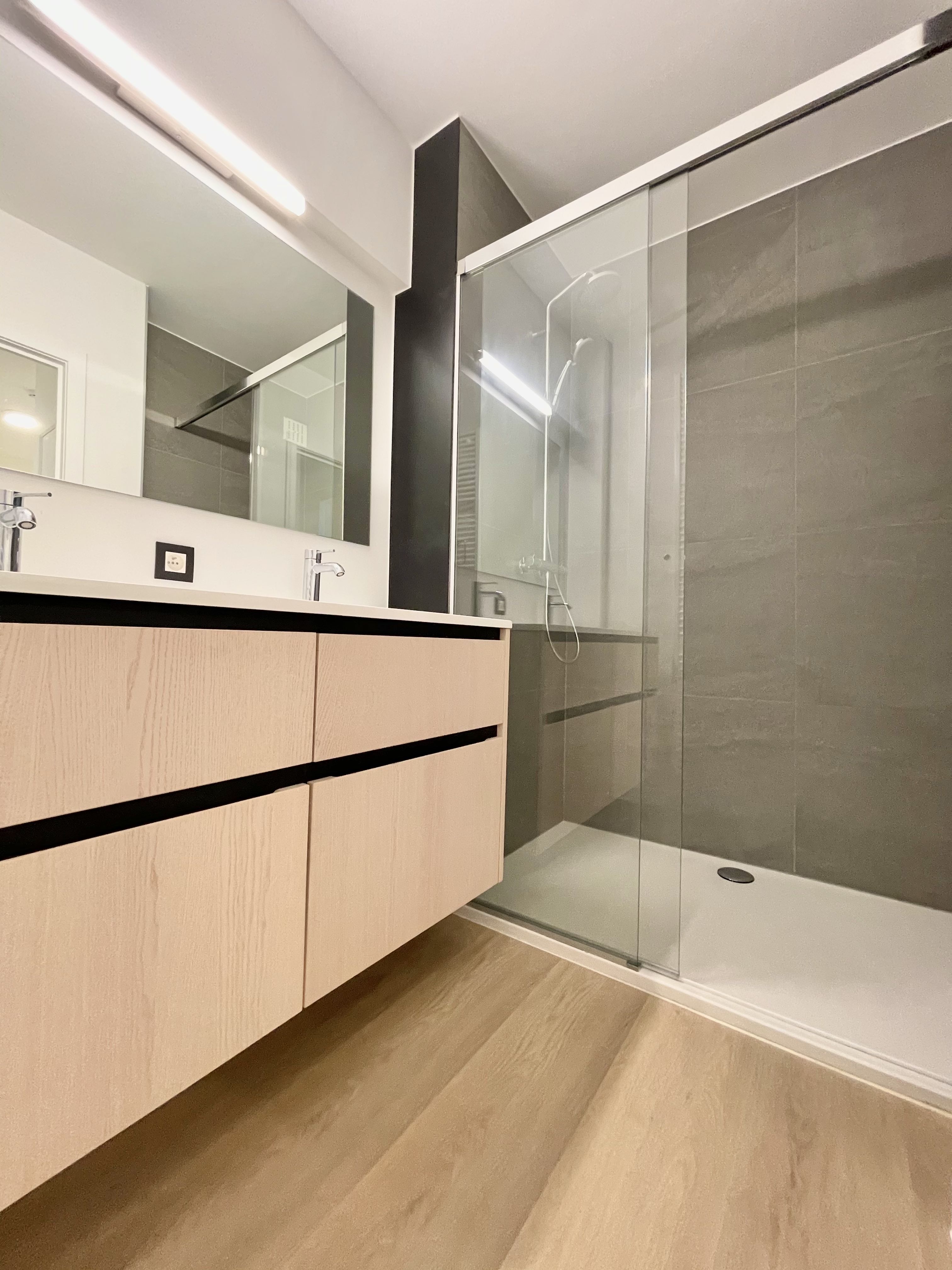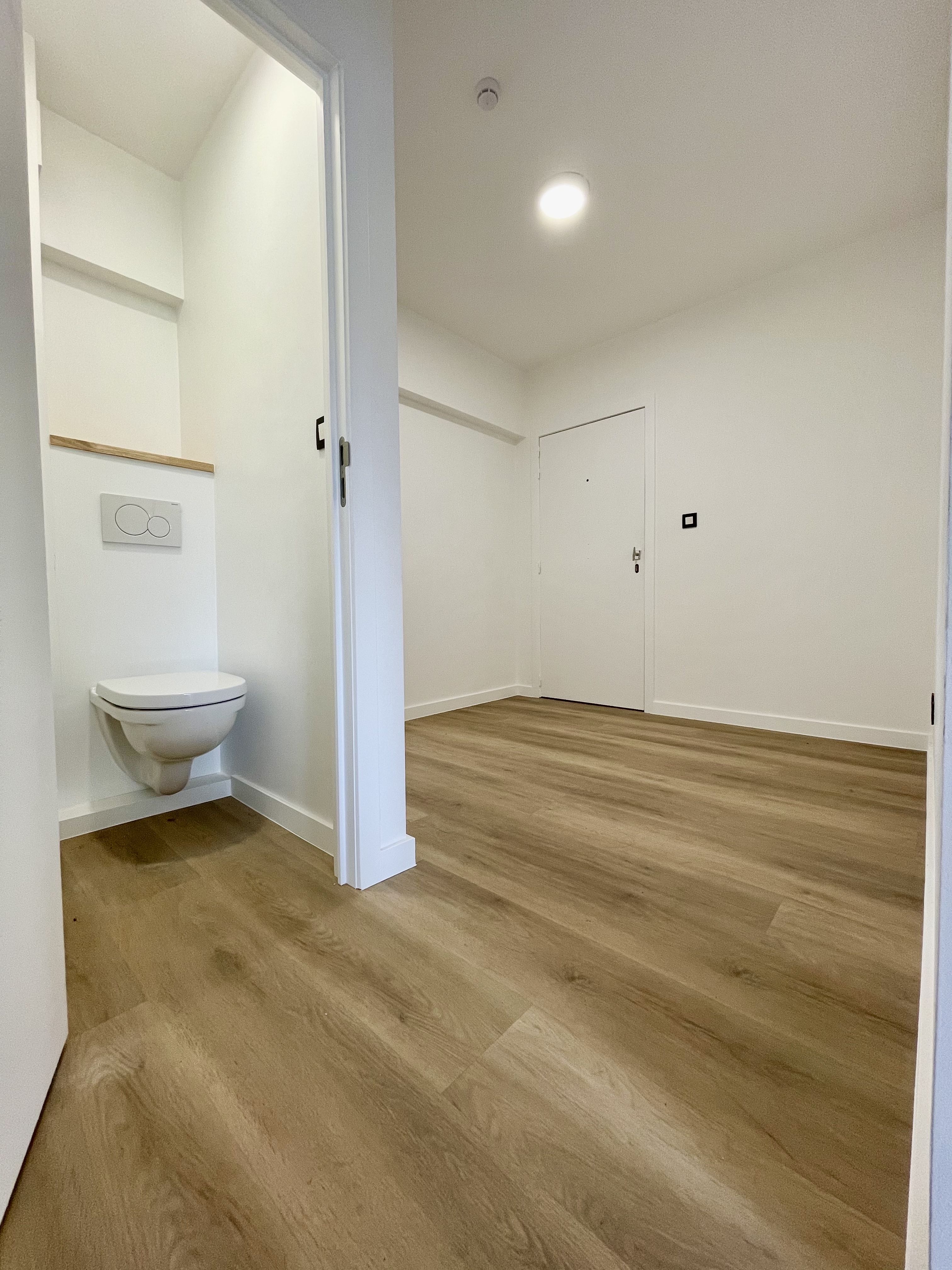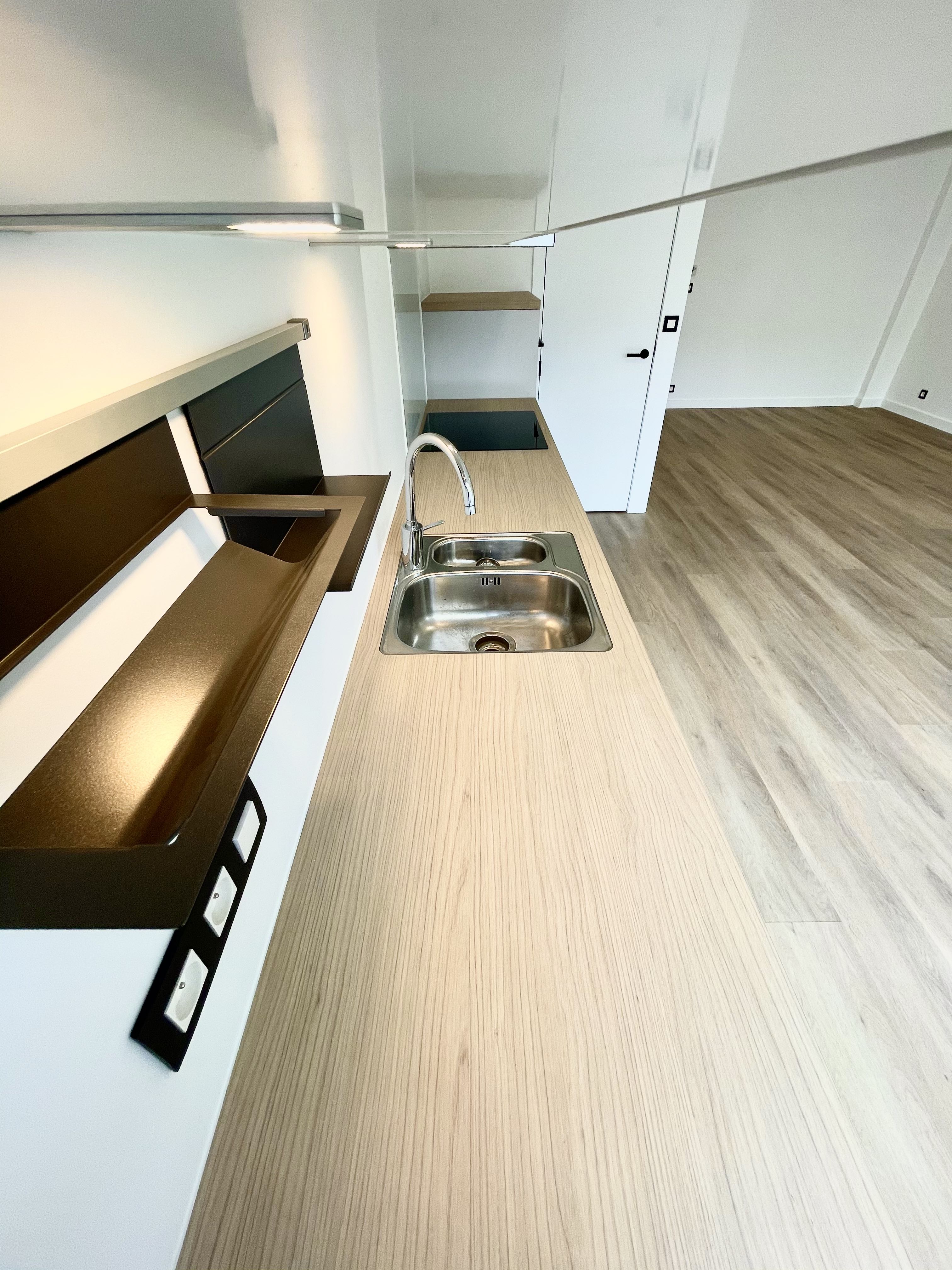 Een ruime inkomhal mondt uit op de gloednieuwe badmaker, de open keuken, de grote leefruimte en de slaapkamers.